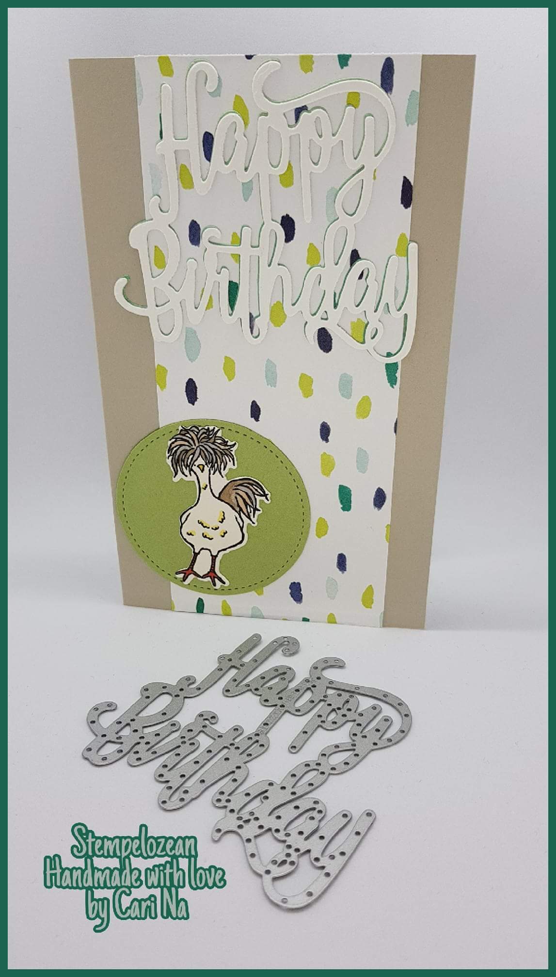 Das Framelit "Happy Birthday" hab ich gaaanz leicht mit grün hinterlegt und der Hahn steht vor einem "Stickmuster" -Kreis von Stampin´Up!