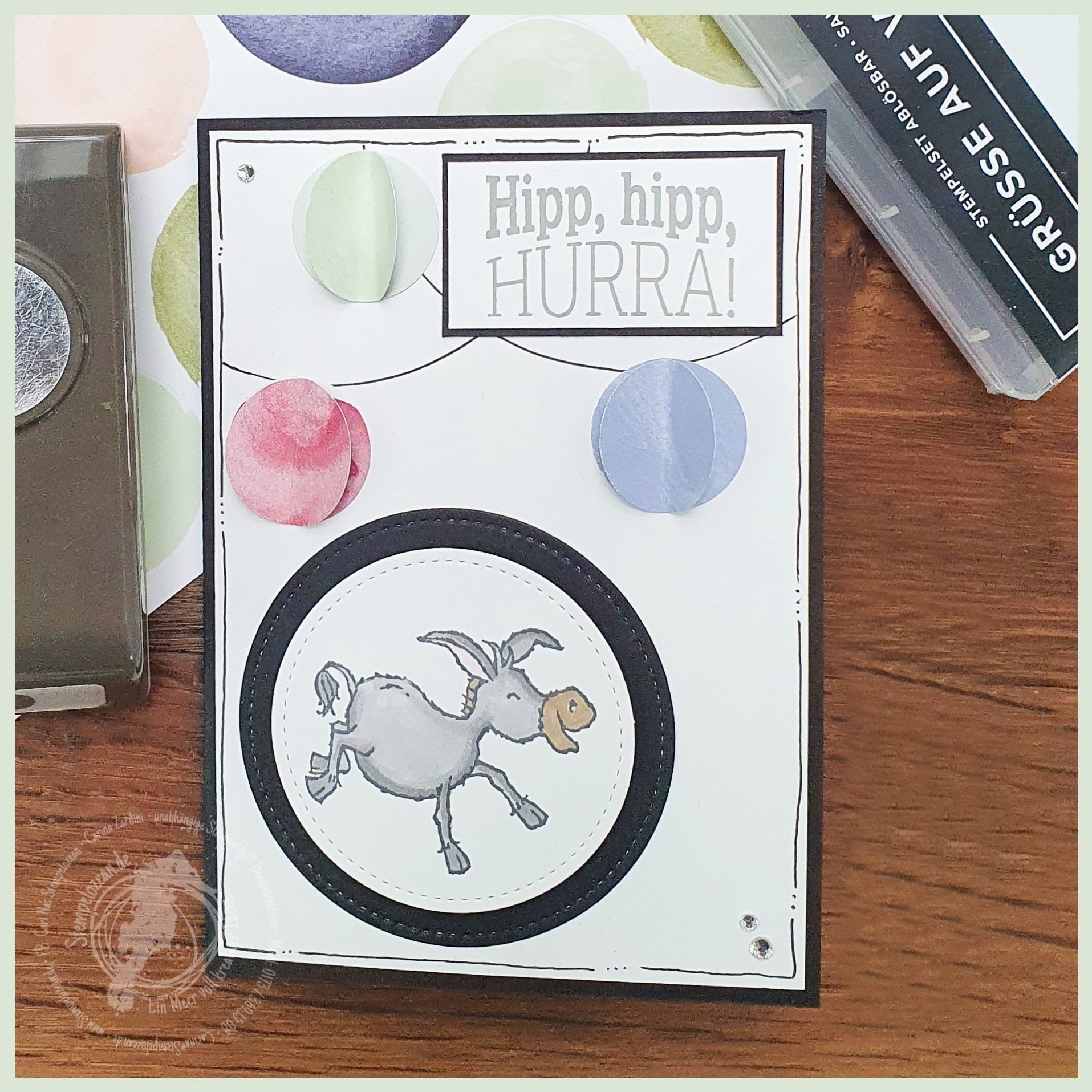 - Was die Mattung betrifft, passiert das gleiche auch mit dem Esel-Kreis – weiß auf schwarz aufkleben (wenn gewollt auch mit Dimensionals). Und den Esel mit den Blend´s colorieren. Damit wären dann auch zwei Elemente schon fertig.