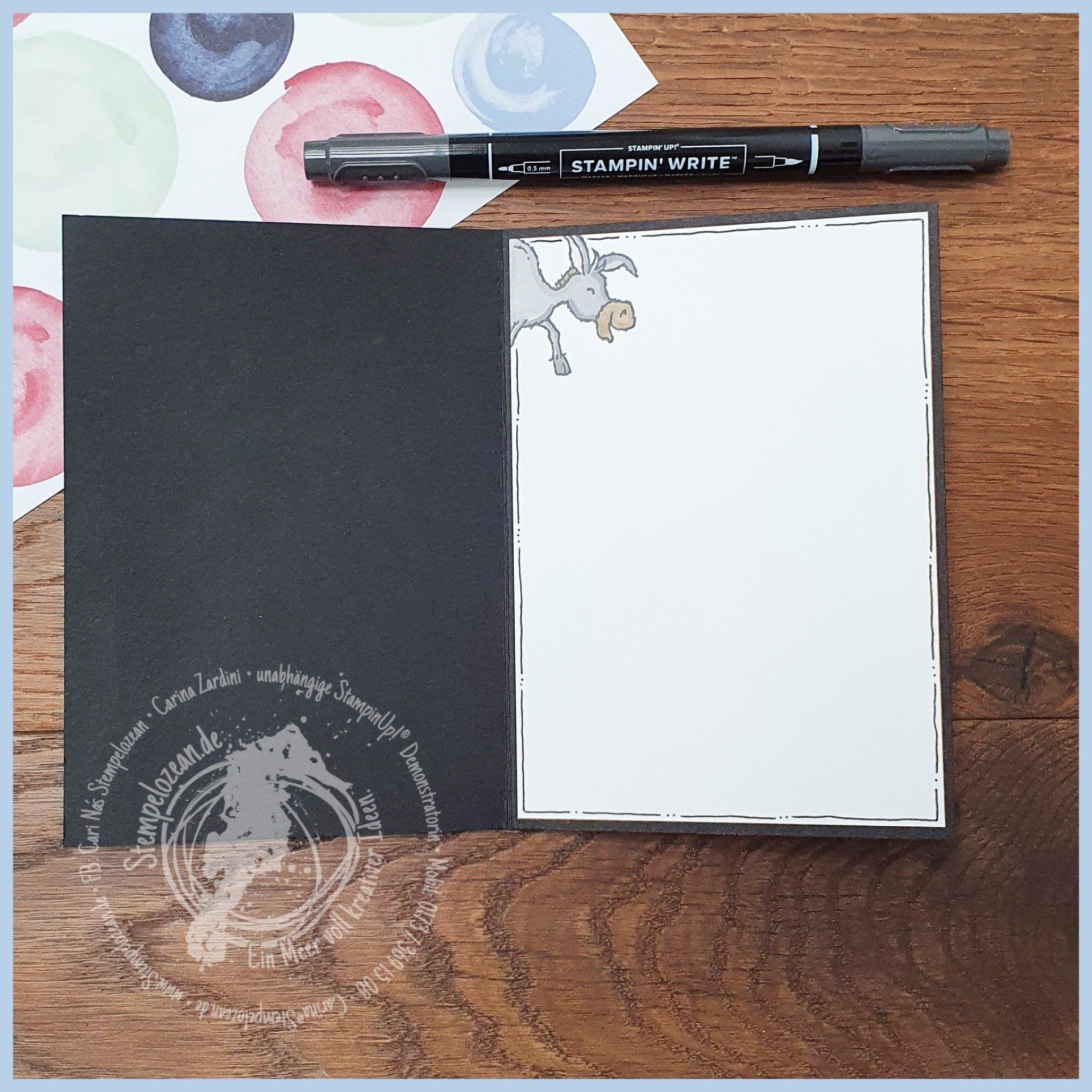 In meinem Fall habe ich am Rand wieder mit dem Stampin´Write Marker in Schwarz gearbeitet und im Vorfeld den halben Esel aufgestempelt um eine Wiederholung rein zu bringen.