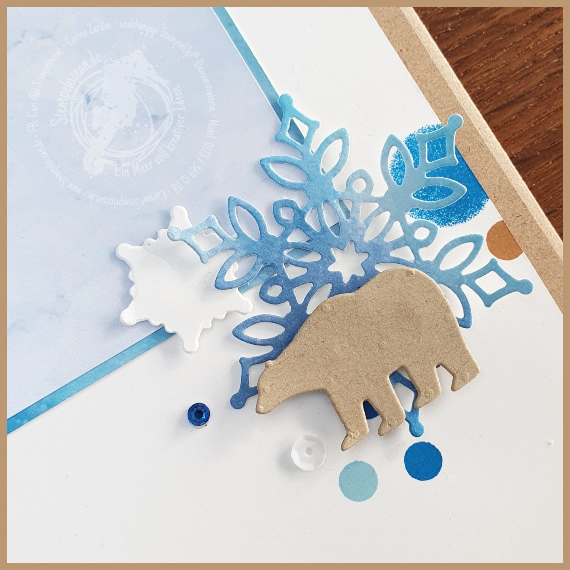 Das Papier für die blauen Schneeflocken habe ich vor dem Ausstanzen mit einem Blush´ eingefärbt.