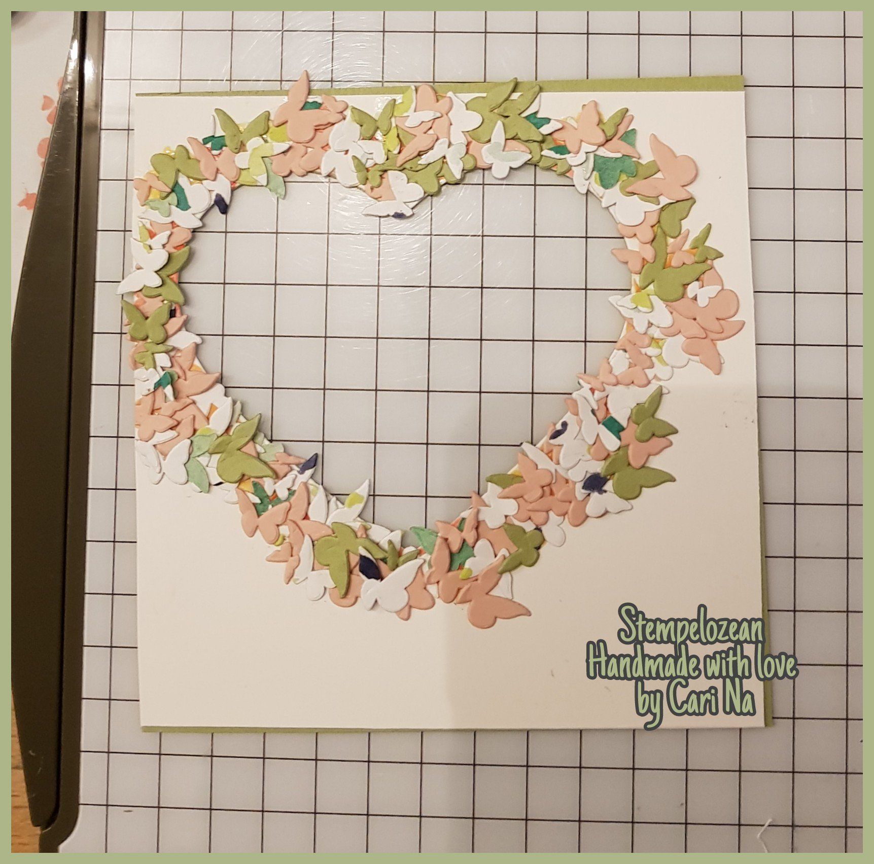 Aber anstatt die Schmetterlinge zu einer Herzform zu legen, wie bei der alten Karte (Ich hoffe Ihr könnt es Euch vorstellen - Hab leider kein Foto davon) wollte ich die Schmetterlinge diesmal um ein ausgestanztes Herz platzieren. Sah dann so aus...