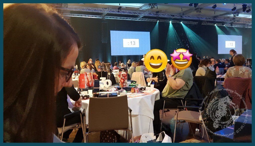 Electro-Musik, große Leinwände, Stampin´Up!- Aufsteller, Stellwände mit den neuesten Produkten, schön gedeckte Tische, Kaffee- und Kuchentische als Überraschung zum 30 jährigen Bestehen, überall lachende Menschen, tolle (Licht-)Stimmung, Tische voll mit Big Shot´s- und ich als Neueinsteigerin mittendrin. *ausflipp*
