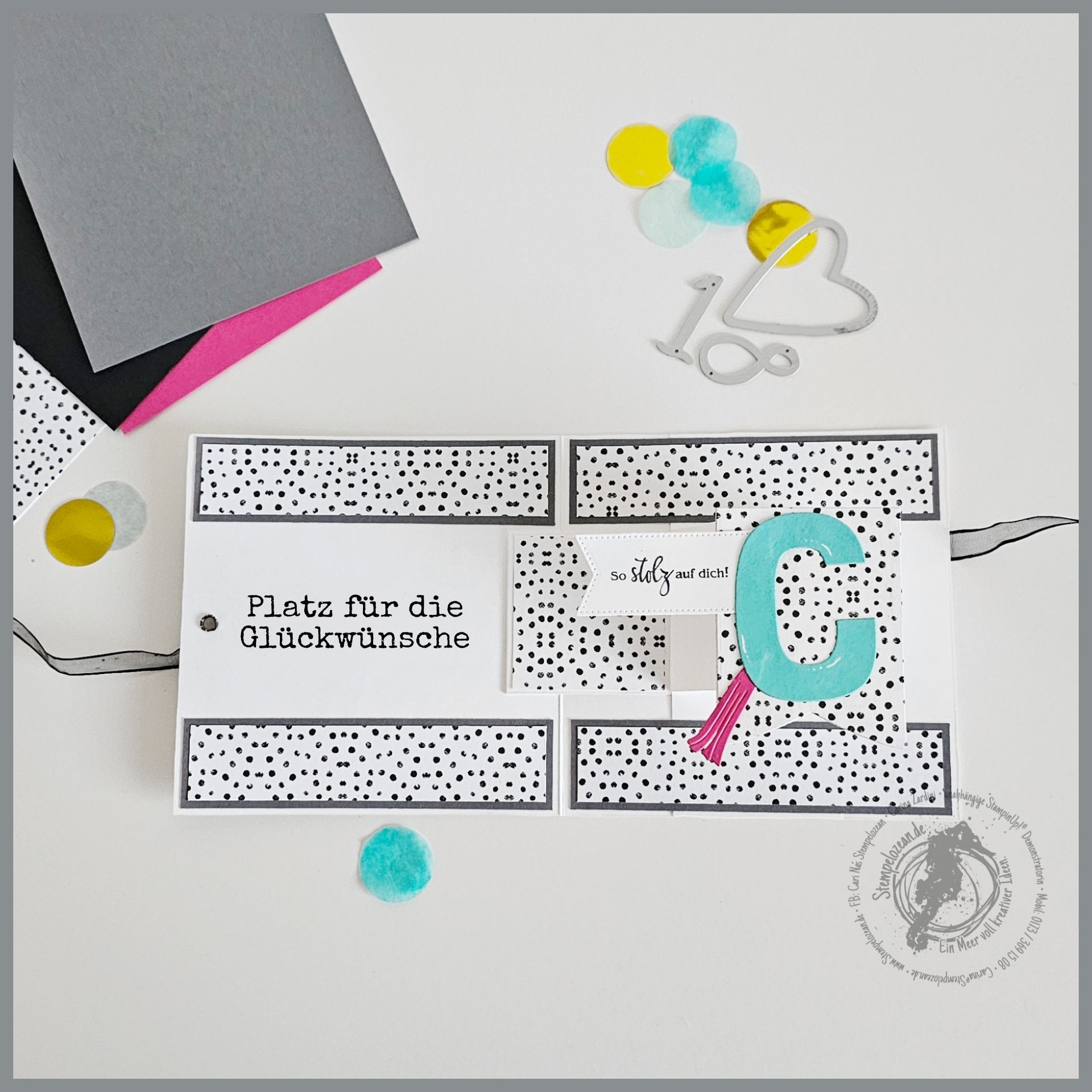 Aus dem Fundus: Das Mäuschen, das Punkte DSP - lässt sich aber easy nschwerkeln ;) - , Kreise mit Büttenrand, das Glitzerband, das Stanz-Herz, das Konfetti (was ist ein Geburtstag schon ohne Konfetti?!?) und die Reste des Silberpapiers.