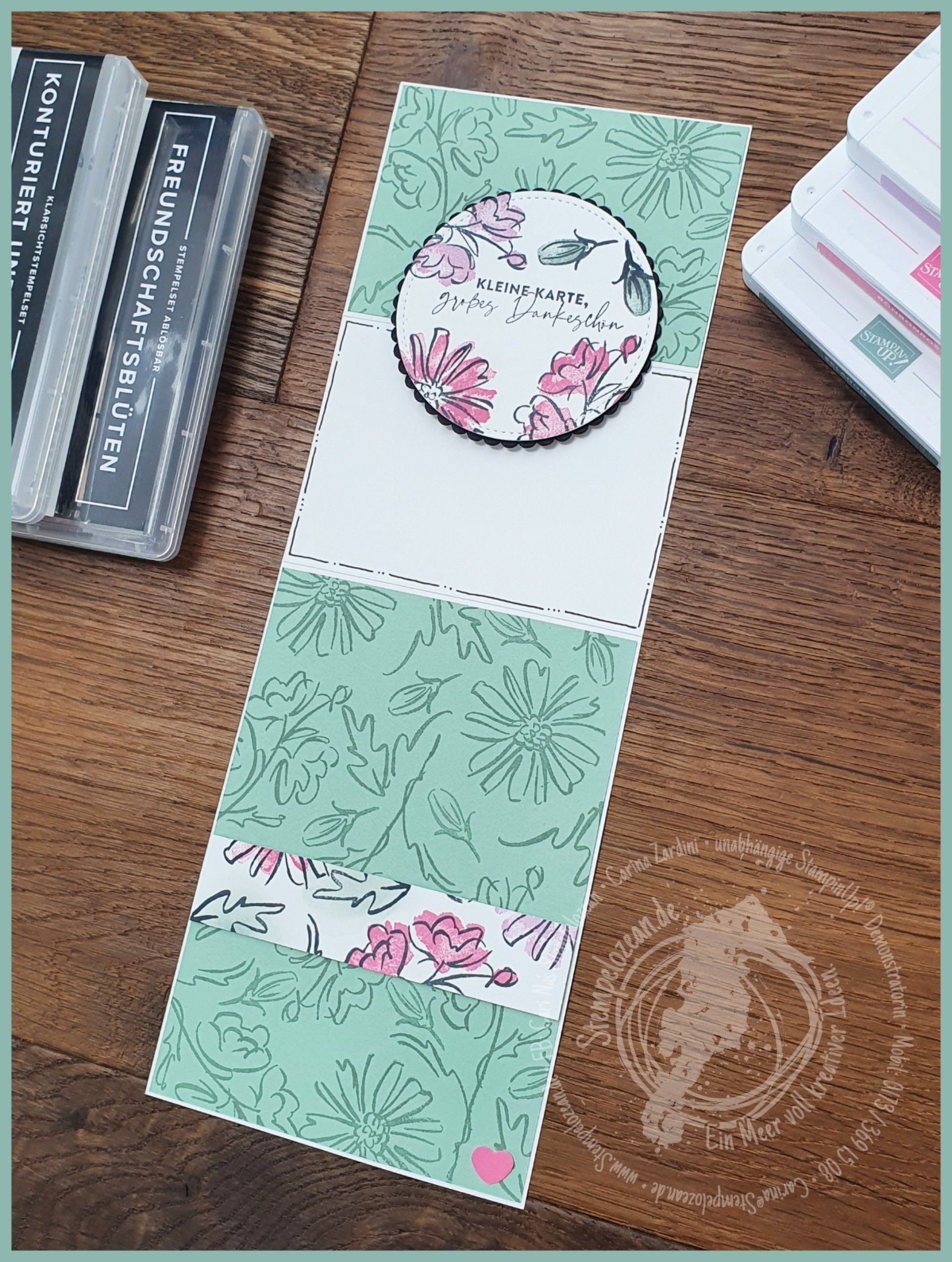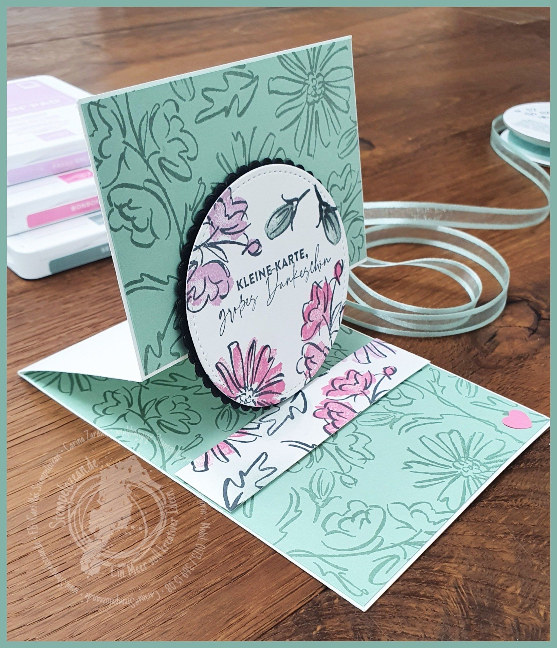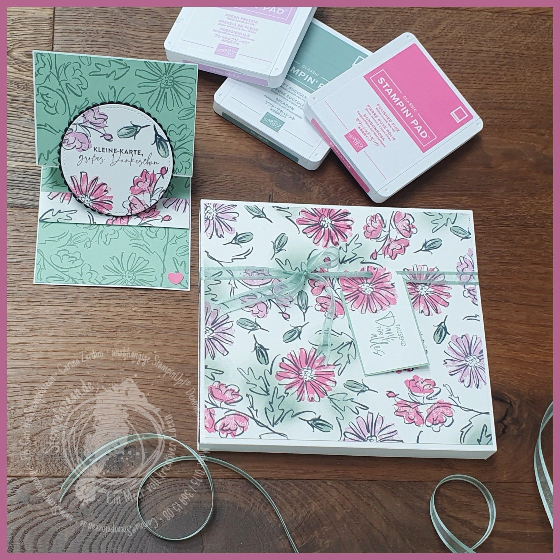 Im heutigen Projekt sind: Bonbonrosa (155712), Freesienlila (155611) und Seladon (155778) in Verbindung mit diesen beiden niegel-nagel-neuen Stempelset´s: "Konturiert und Koloriert" (158358) (1)