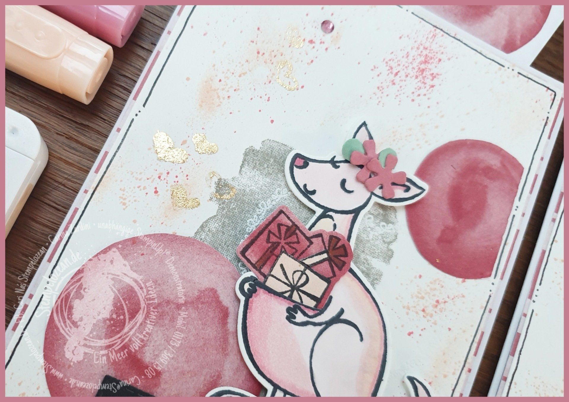 Ich muss zugeben, anfangs hatte ich auch "nur" Babykarten und Geburtstage im Kopf bei diesem Set. Aber je mehr ich darüber nachdenke, desdo mehr Gelegenheiten schwirren mir durch den Kopf ;) Sie wird sicher, wie es sich für ein Känguru gehört, noch öfter von meinem Tisch hüpfen.
