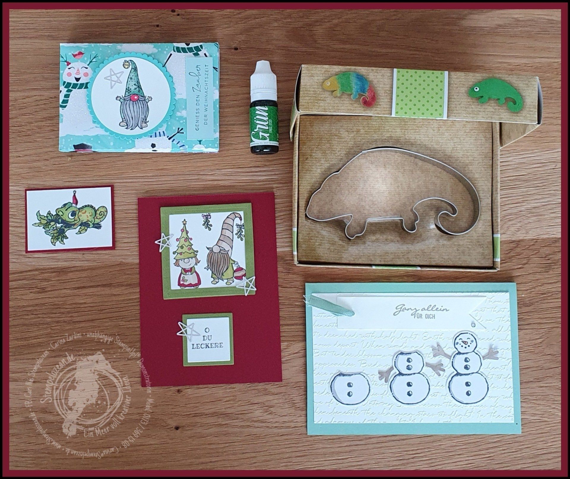 Ausserdem natürlich noch eine Karte - mit Schneemännern- und ein kleiner Geschenkanhänger mit süssem Chamäleon.